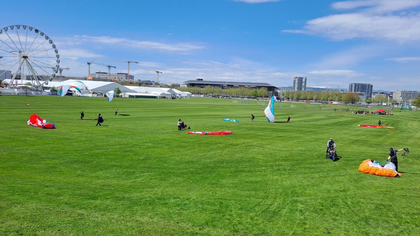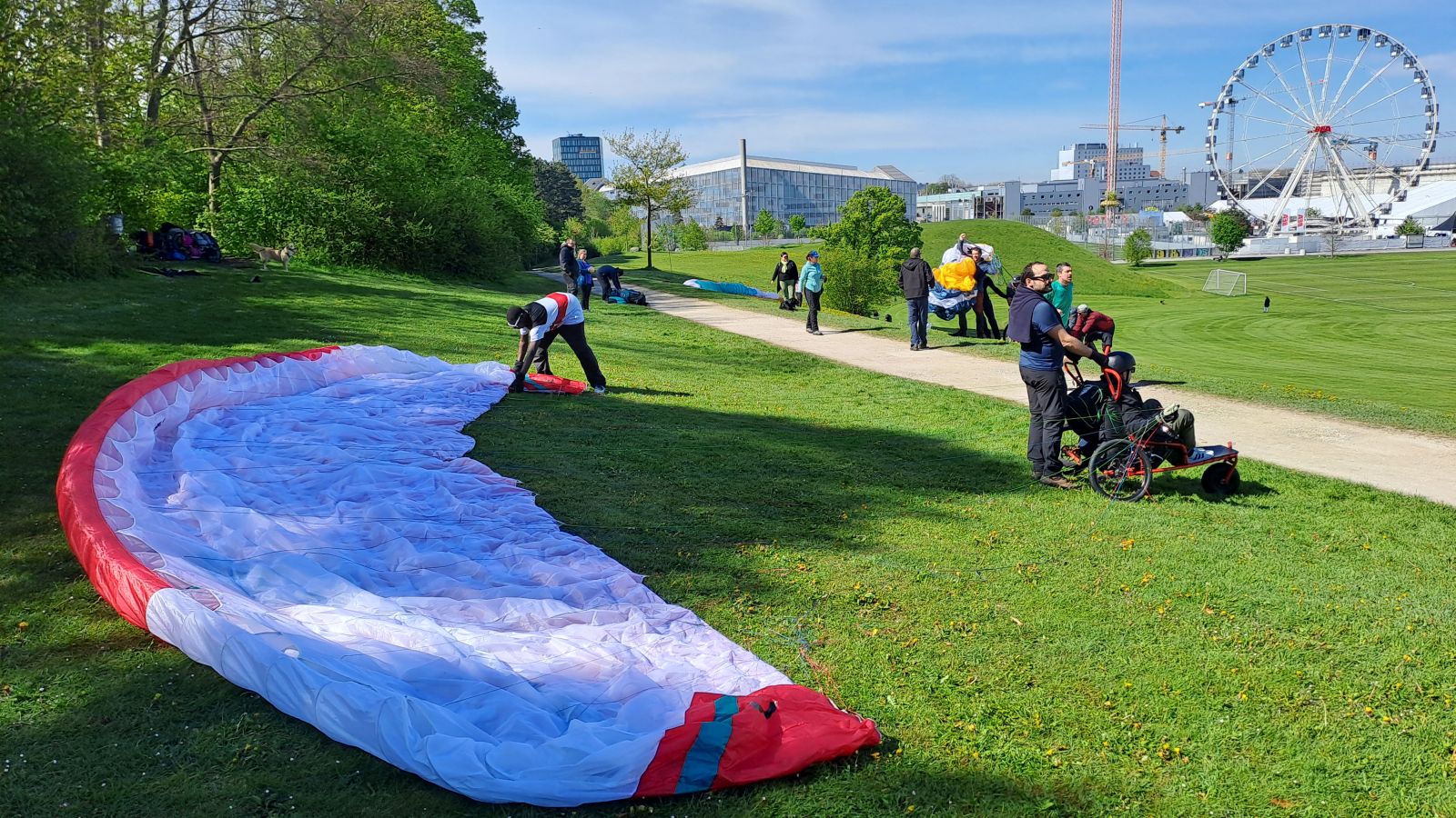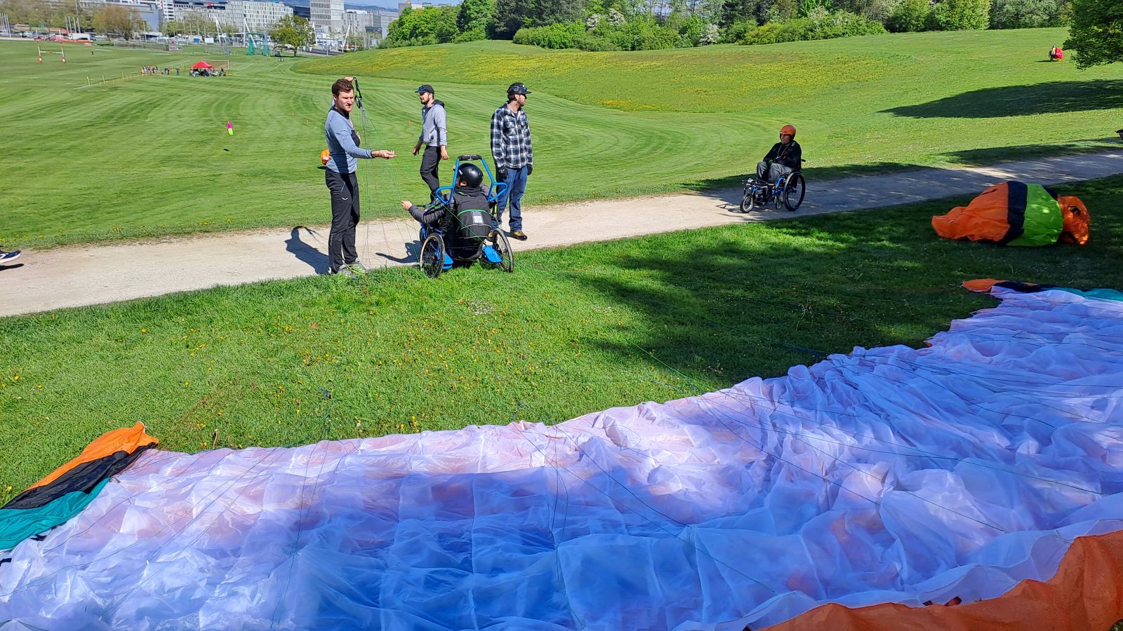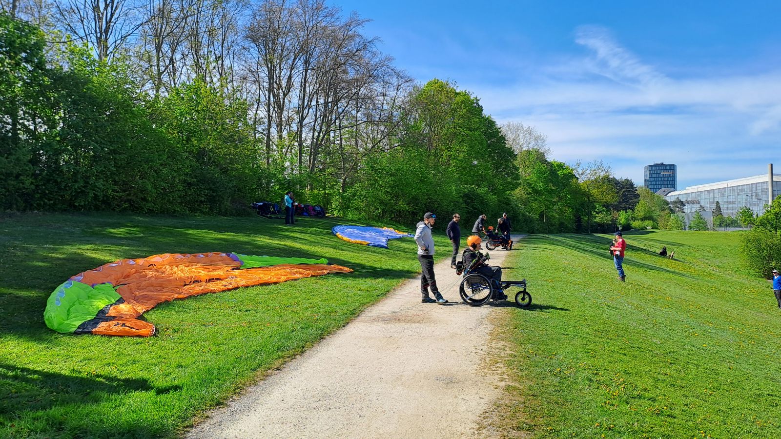 Endlich, nach einer längeren Durststrecke spielte das Wetter wieder mit. Die Sonne kündigte sich schon am frühen Morgen an, als wir uns Richtung Bern auf den Weg machten. In der grossen Allmend führten wir gemeinsam mit der Gleitschirmflugschule Solothurn (FLUSO) einen Grundkurstag für Fussgänger und Rollstuhlfahrer durch. Es war ein warmer, sonniger Tag mit idealen Windverhältnissen.